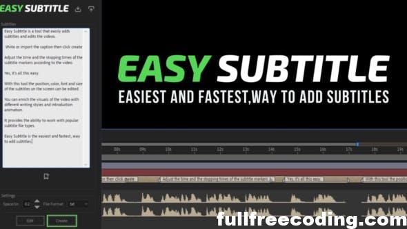 Easy Subtitle is a tool that easily adds subtitles and edits the videos.import or Write the caption then click create Adjust the time and the stopping times of the subtitle markers according to the video.Yes, its all this easy. With this tool the position, color, font and size of the subtitles on the screen can be edited. You can enrich the visuals of the video with different writing styles and introduction animation. It provides the ability to work with popular subtitle file types. It consists of project file and script file. The script file is in the package. no plugin required Easy Subtitle is the easiest and fastest, way to add subtitles.